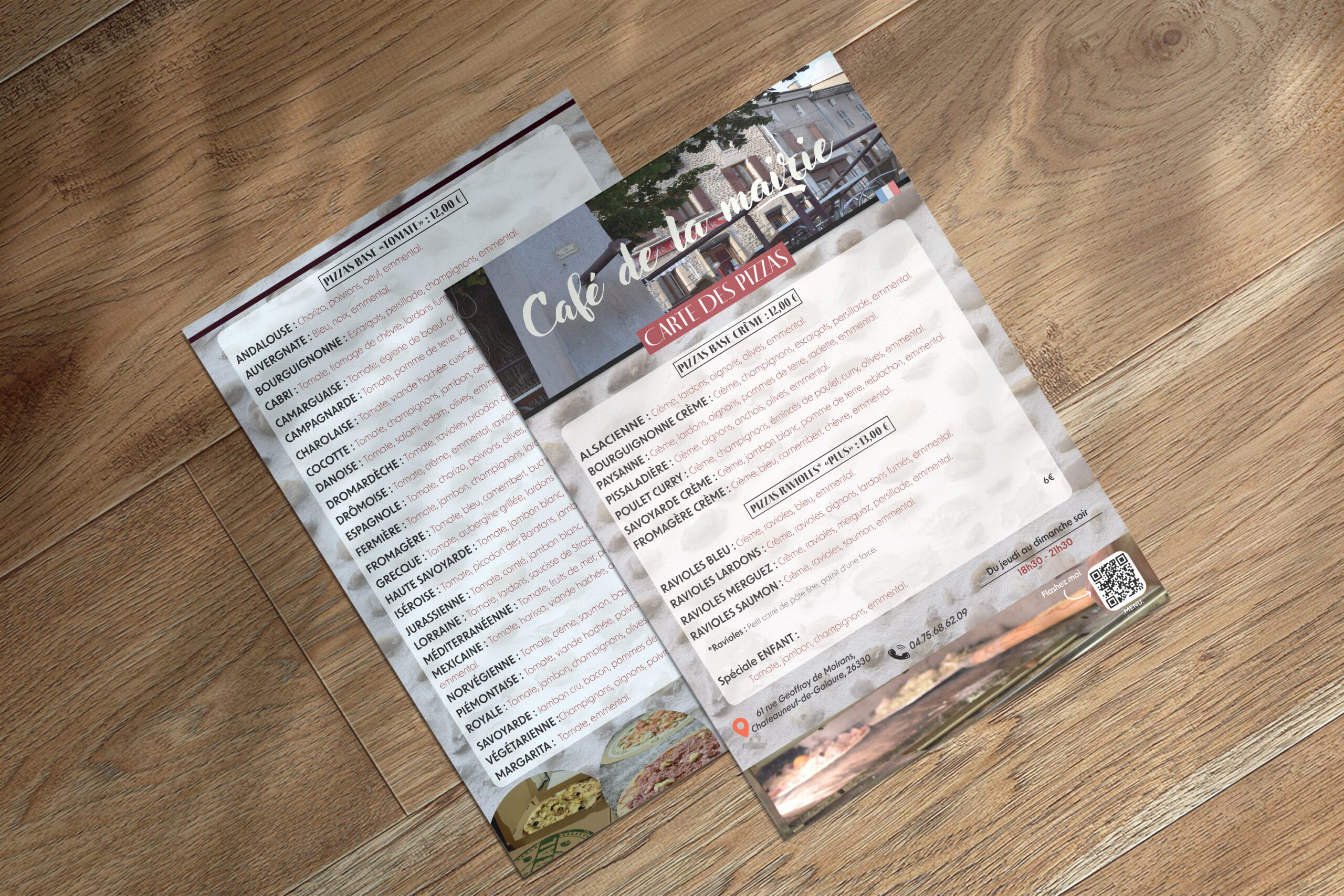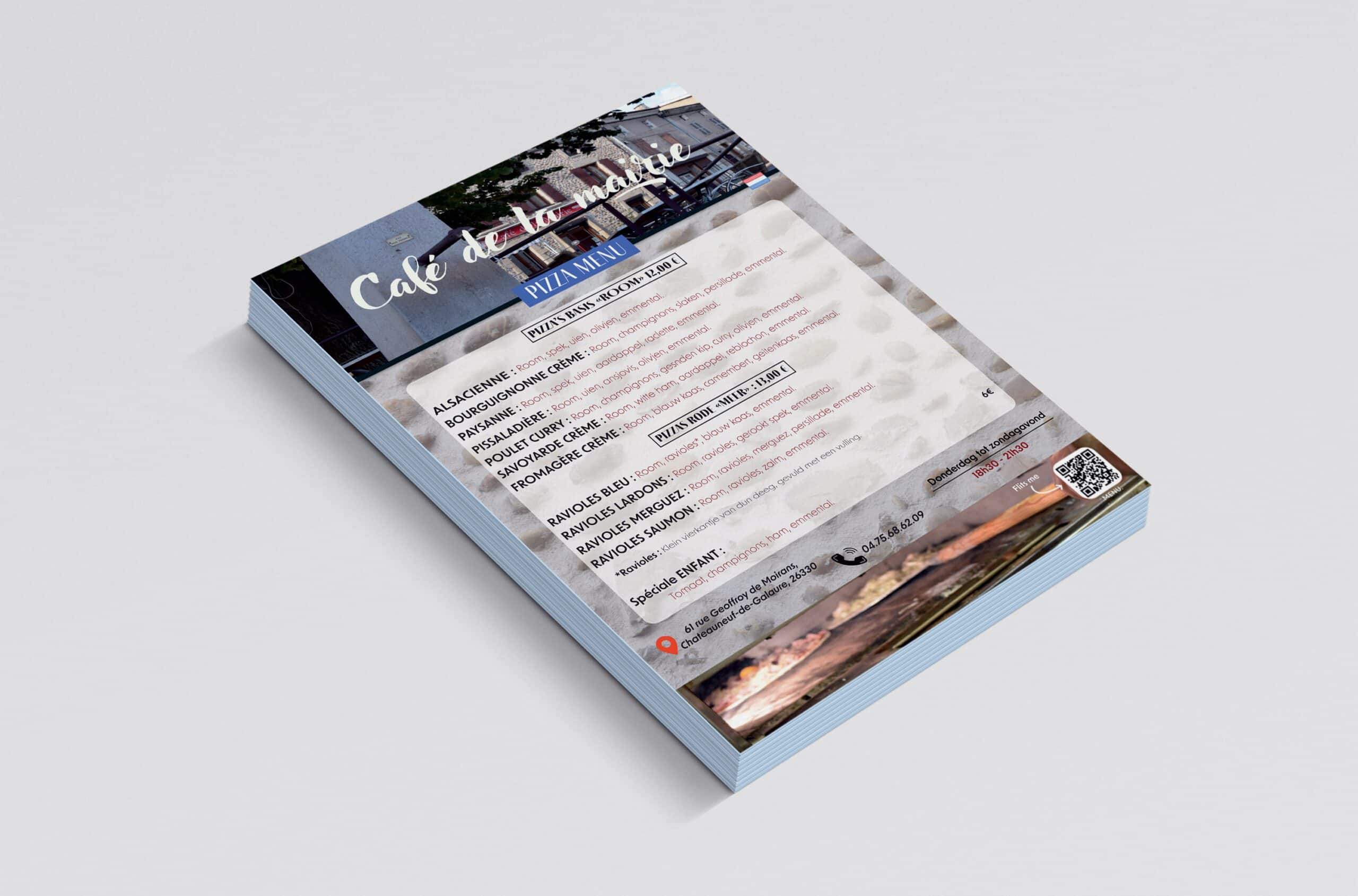 Créer deux supports de communication pour la pizzeria, alliant respect de l’identité visuelle et adaptation à un public multilingue.