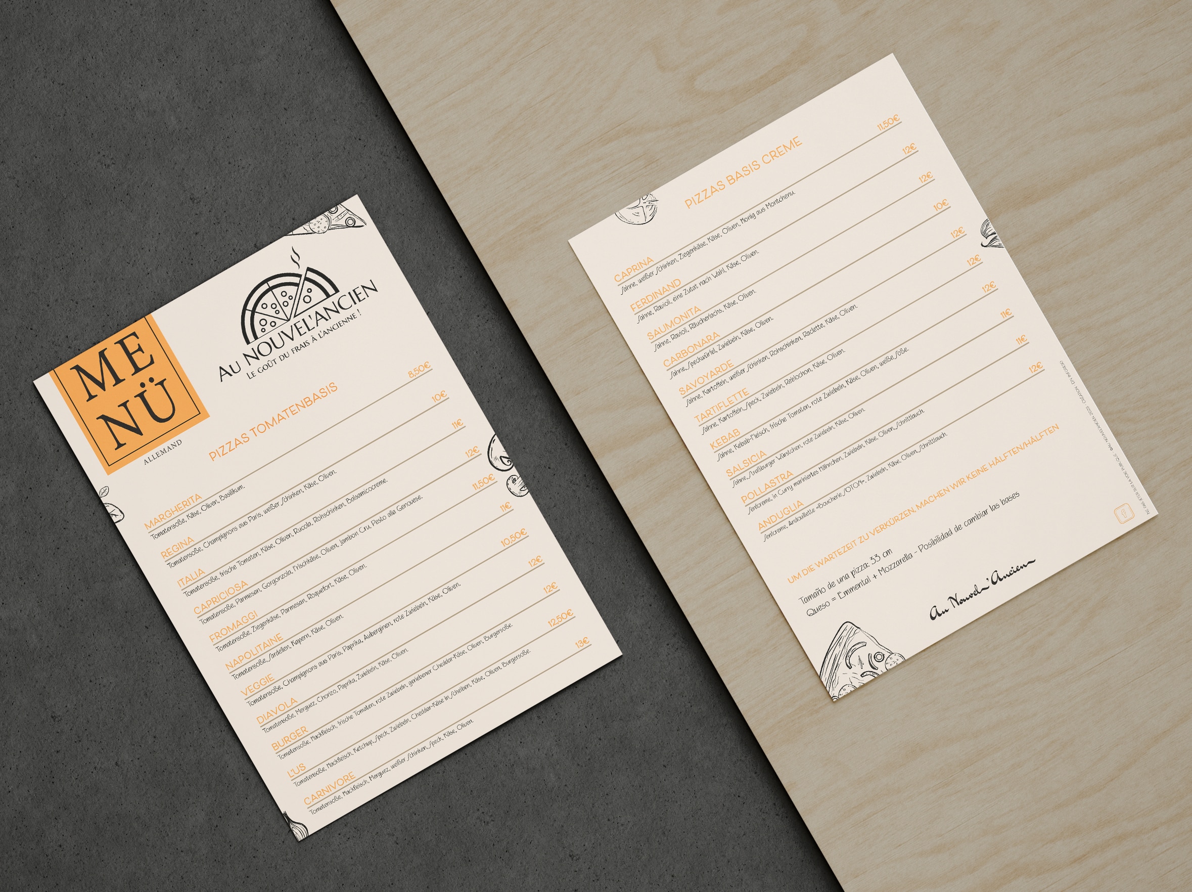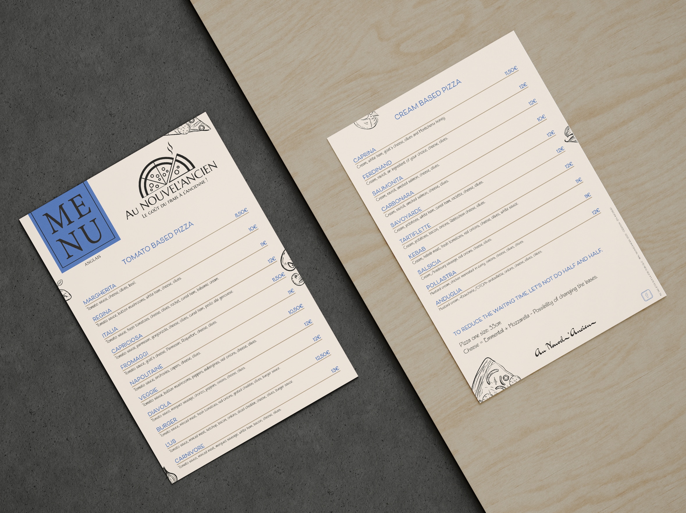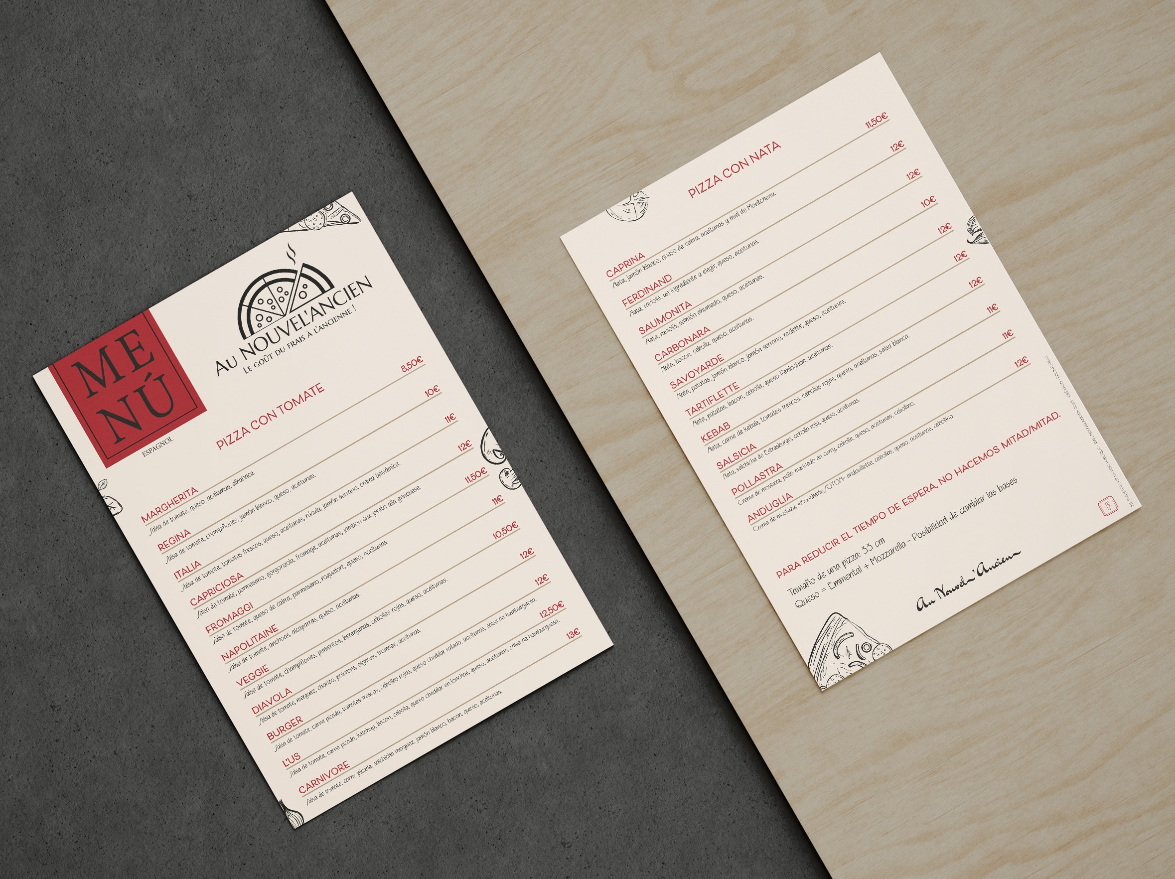 - Création d’un menu complet en adéquation avec la charte graphique de l’établissement tout en proposant un visuel universel qui répond à une clientèle internationale.